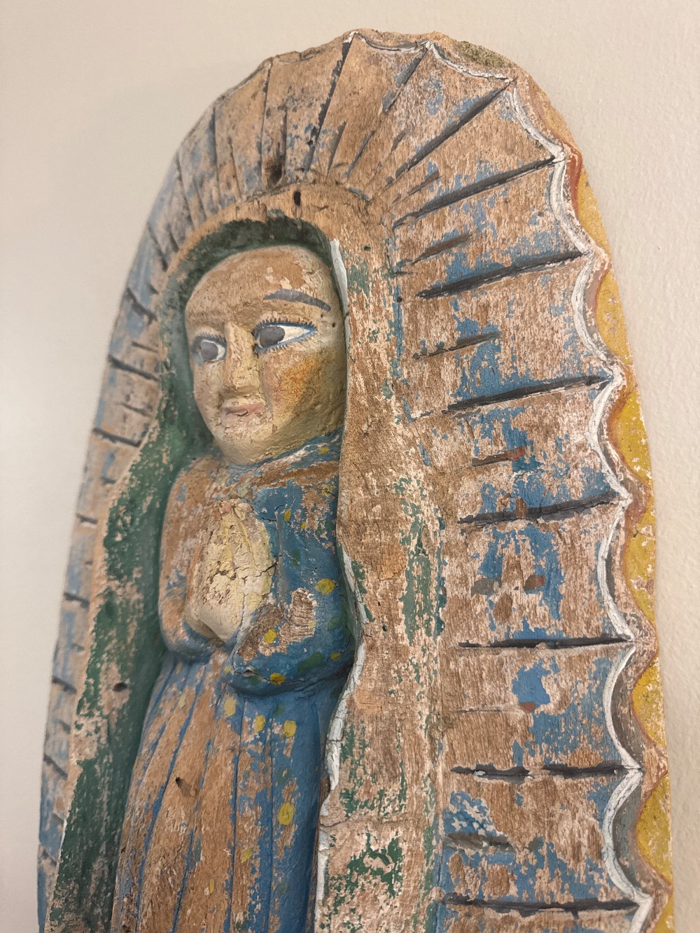 Collector's Item Alert! Antique carved wood Virgin of Guadalupe wall art. 25"h x 12"w