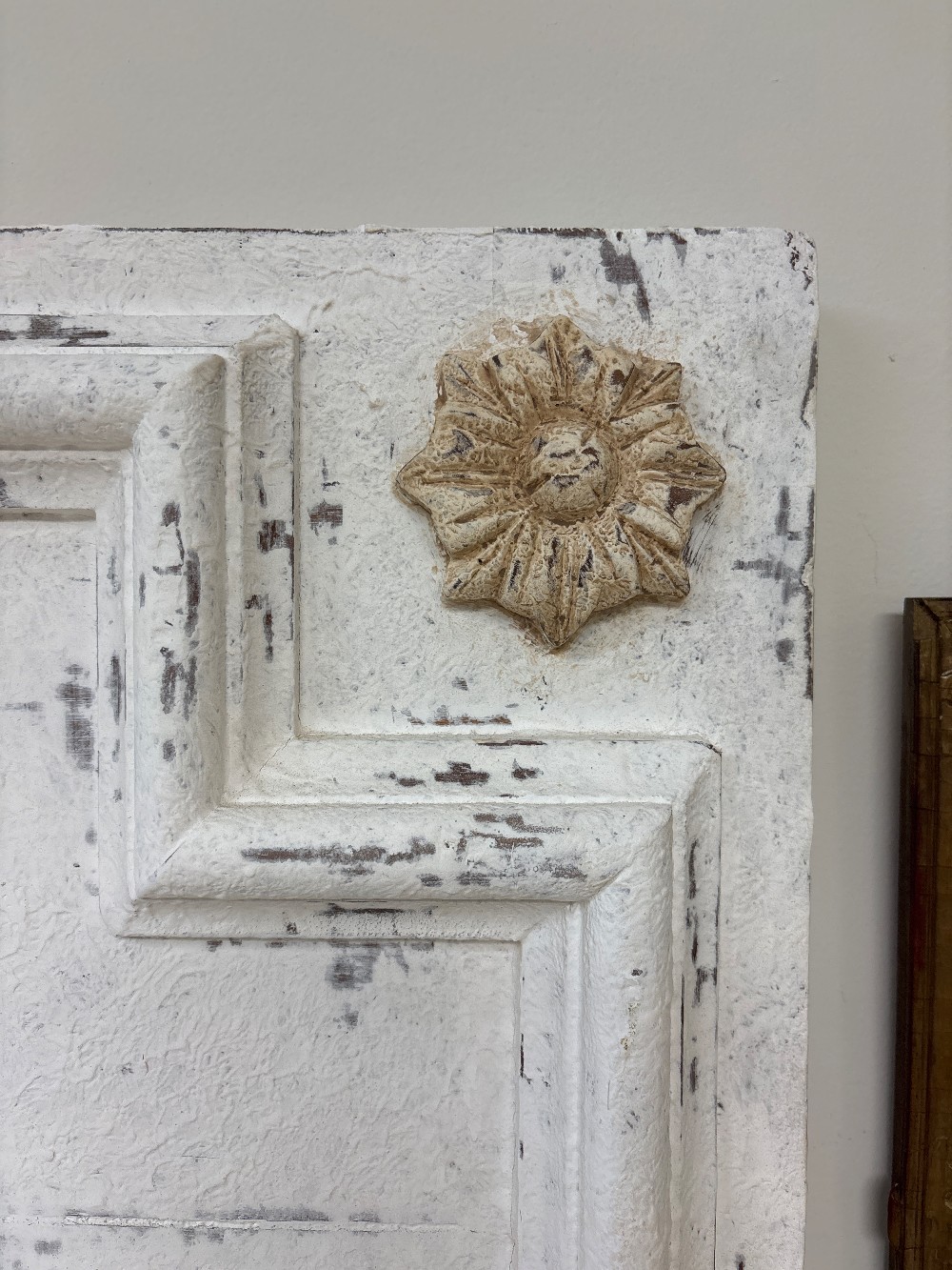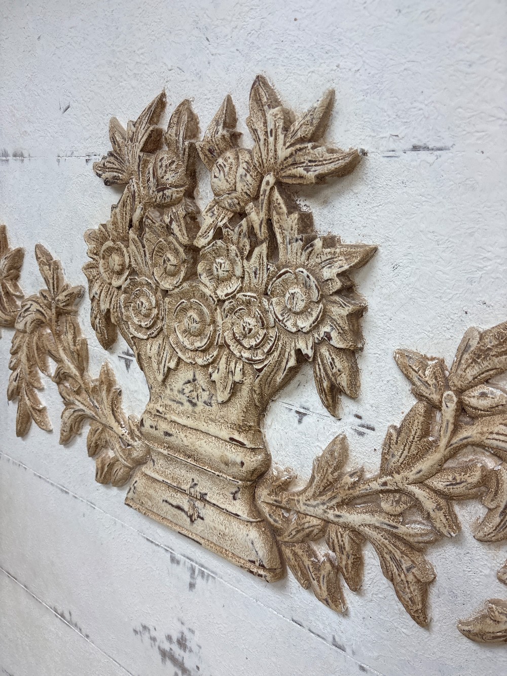 Antique wood, king-size headboard with wooden floral appliqué 79”w x 72”h
