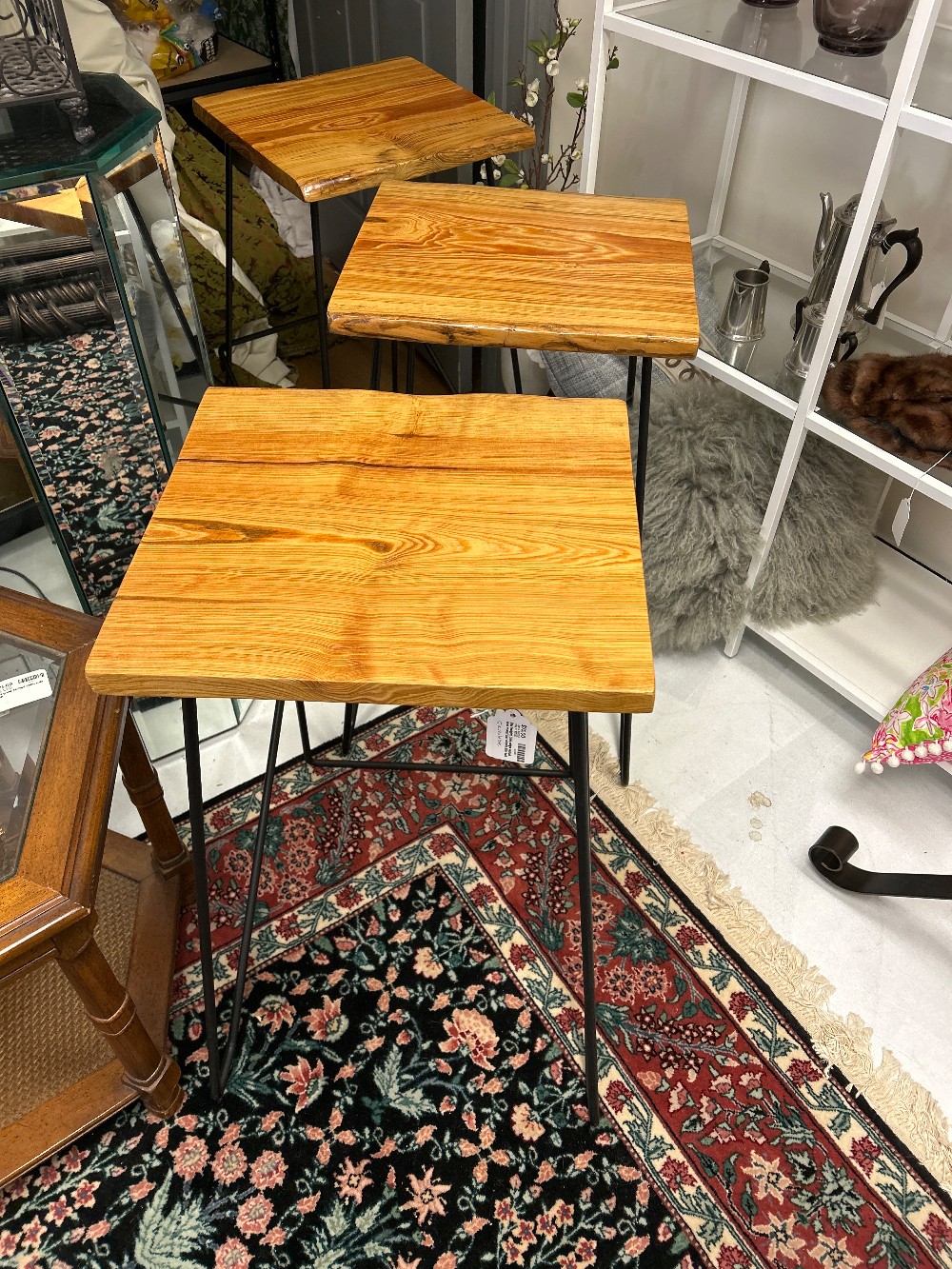 Beautiful, hand made live edge wood heart of pine bar height bar stools. 5 Available.