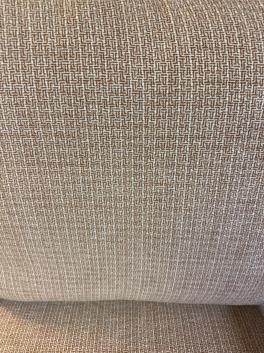 Handsome spindle chair with custom fabric in rust colored geometric small pattern.26.5w x 31w x 40h