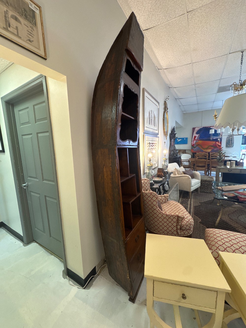 Indonesian canoe turned shelving unit One of a kind piece 8 feet tall, 21 inches wide, 13 inches deep 13 inches deep, 21 inches wide