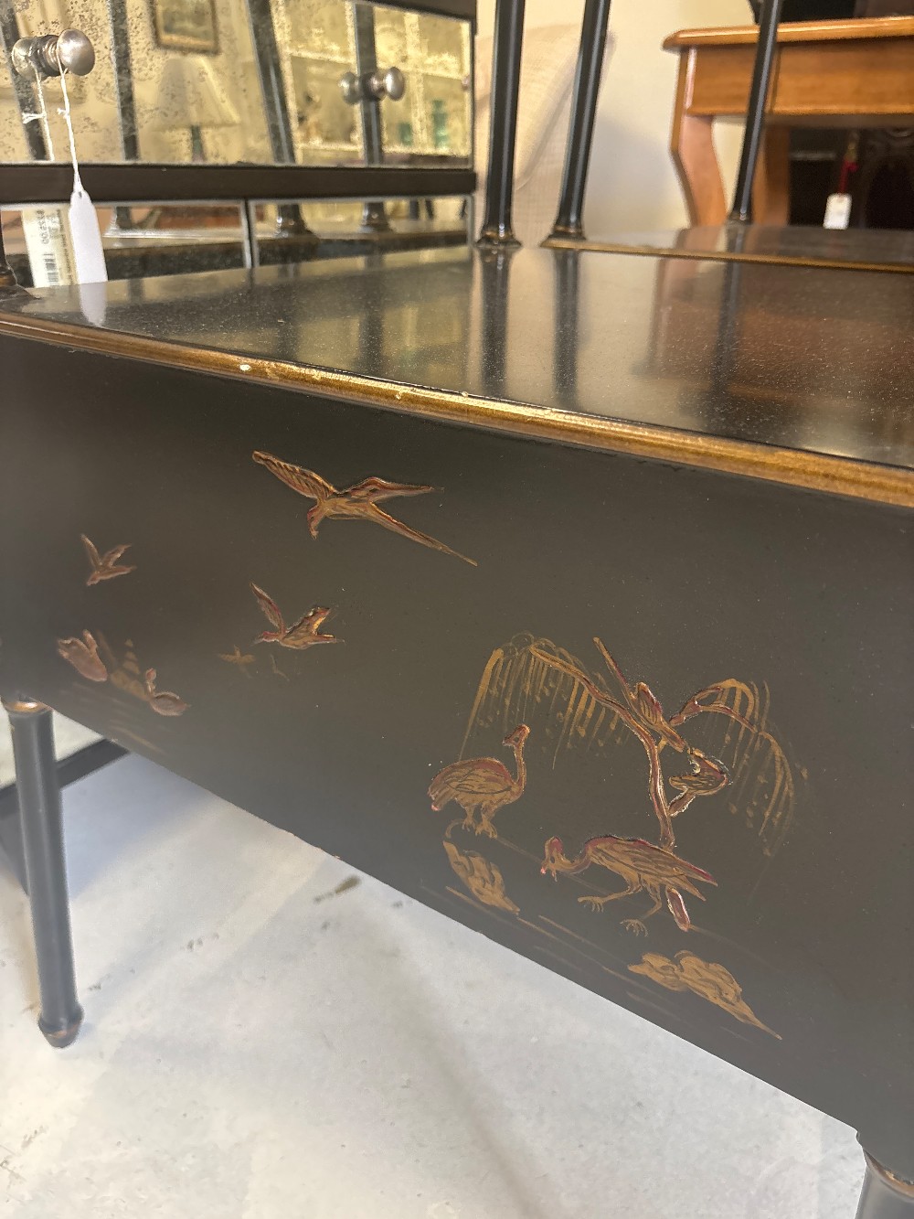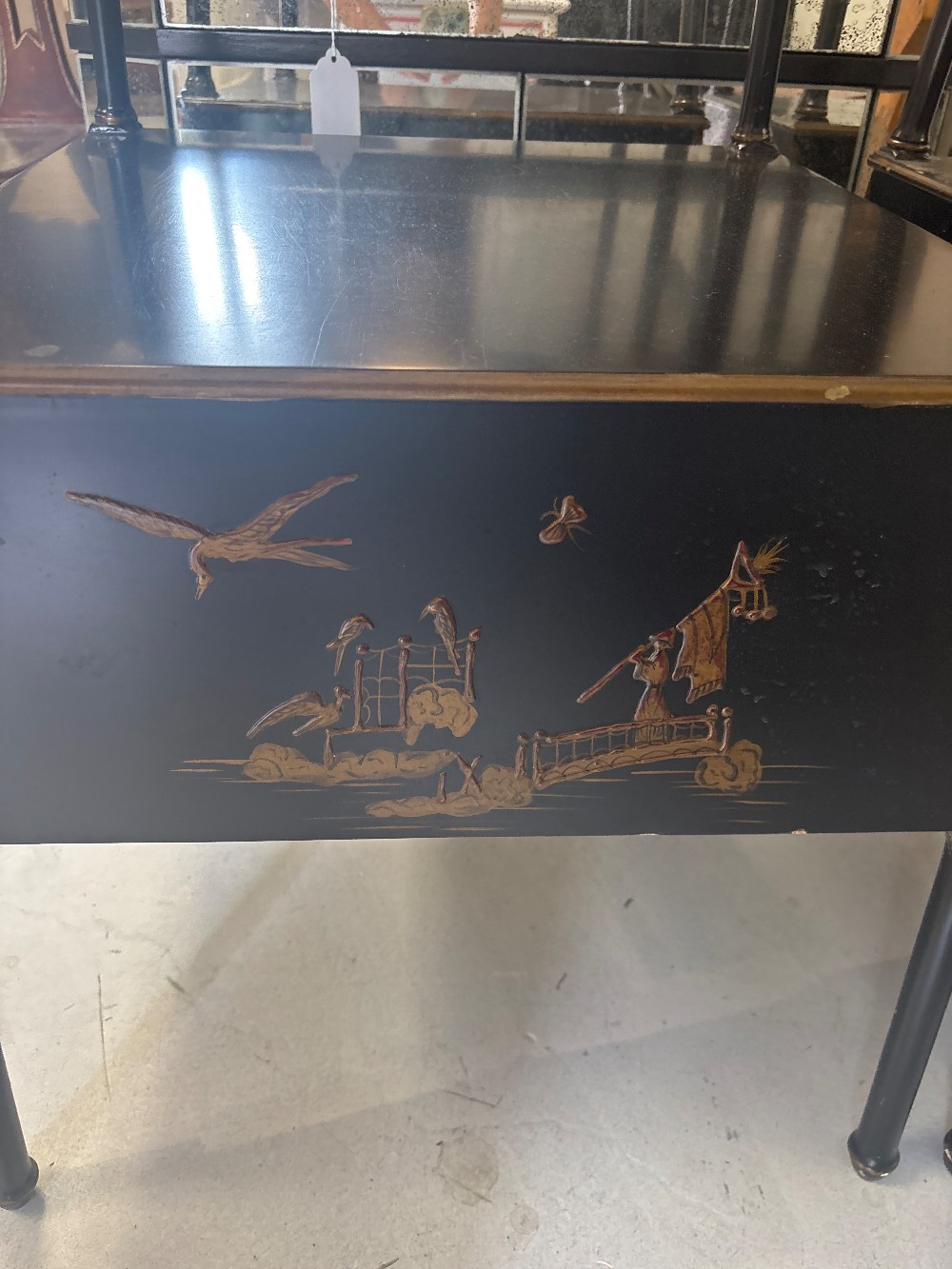 Shinwari style three shelf etagere black with gold painting. 20” w x 67.5h