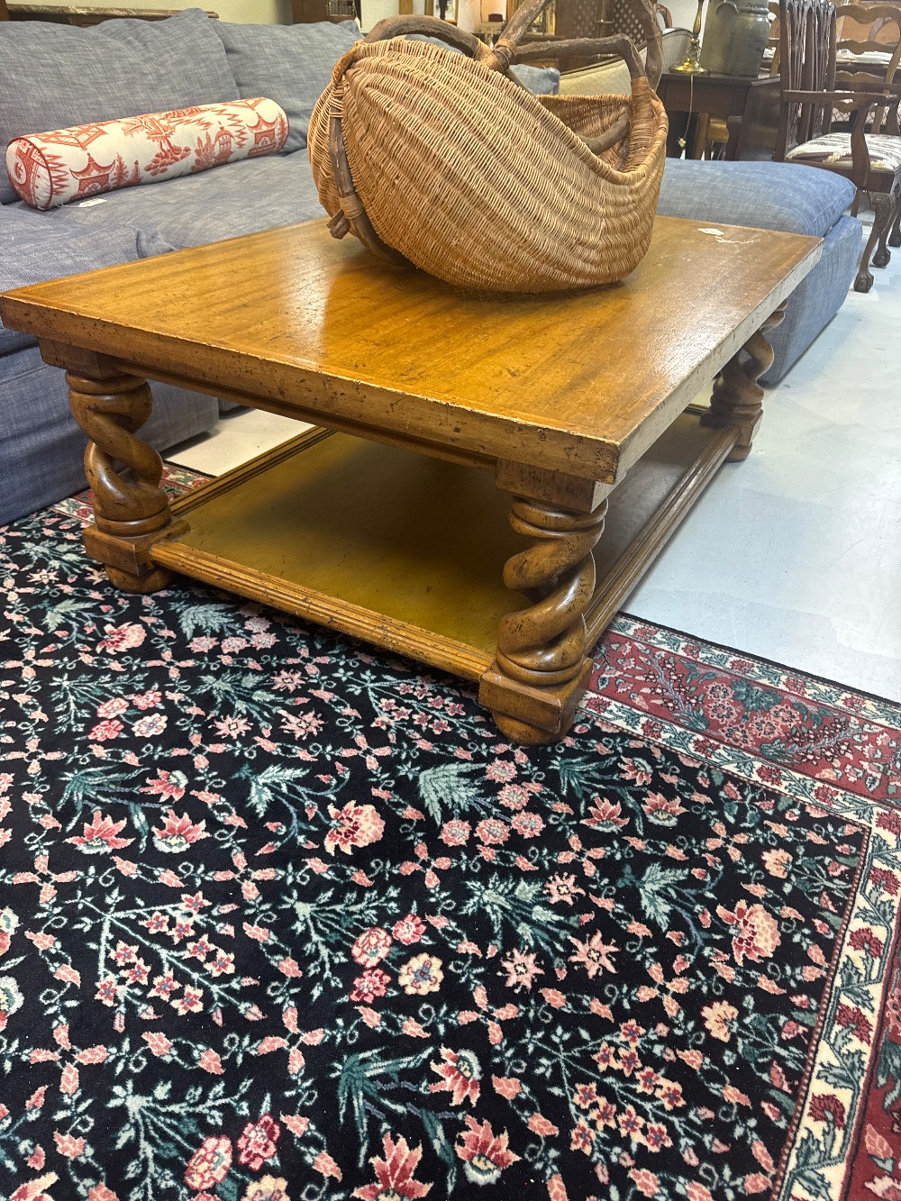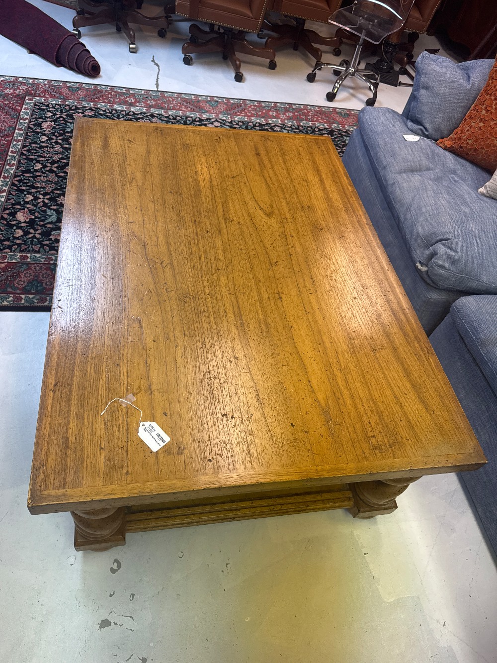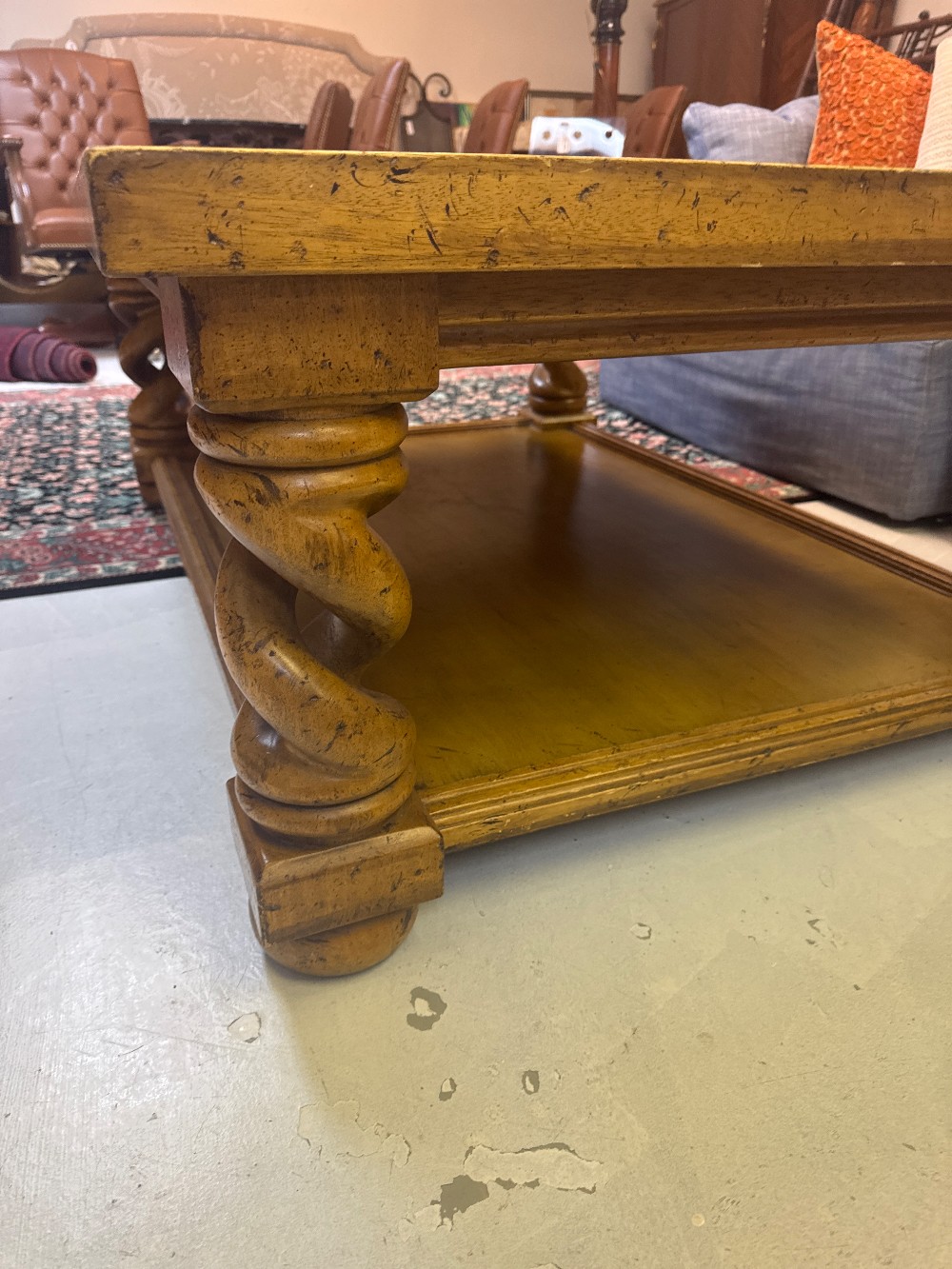 So perfect for a family room, mountain home, or wherever your gatherings happen. Wonderful wood coffee table with beautiful turned Wood legs. 54" wide x 38" deep by 20" tall