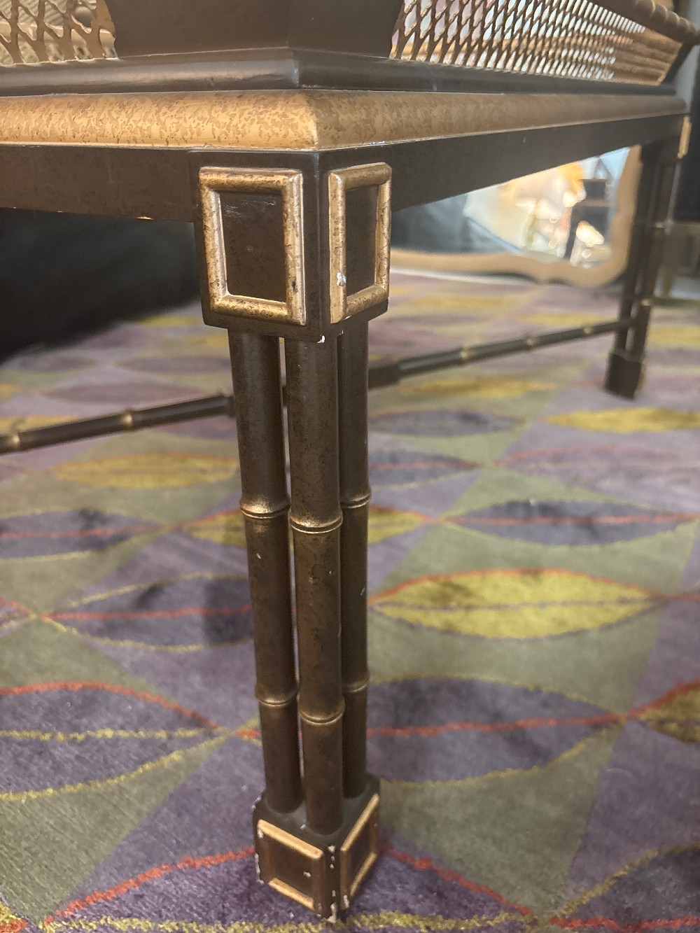 tortoise shell finish with pierced gallery. Raised on bundled bamboo legs connected with X-stretcher and terminating on block footing. Dimensions 38ʺW × 24.5ʺD × 24.25ʺH