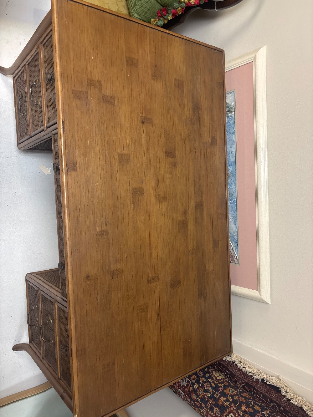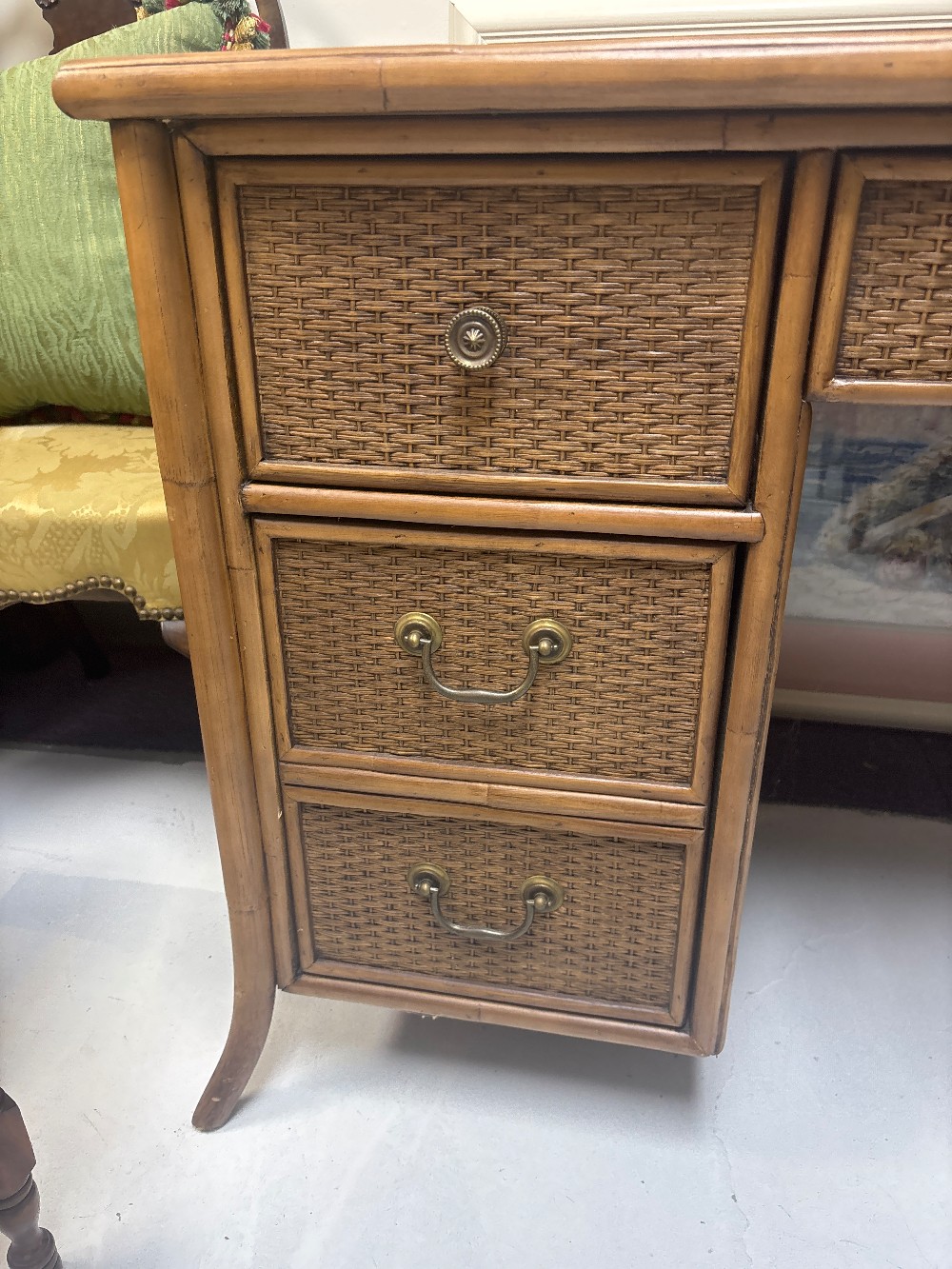 Elevate your home office with this wonderful bamboo and Rattan Desk, perfect for your writing/typing needs. Beautiful enough to have in the living room! 54" long x 30" deep x 30" tall