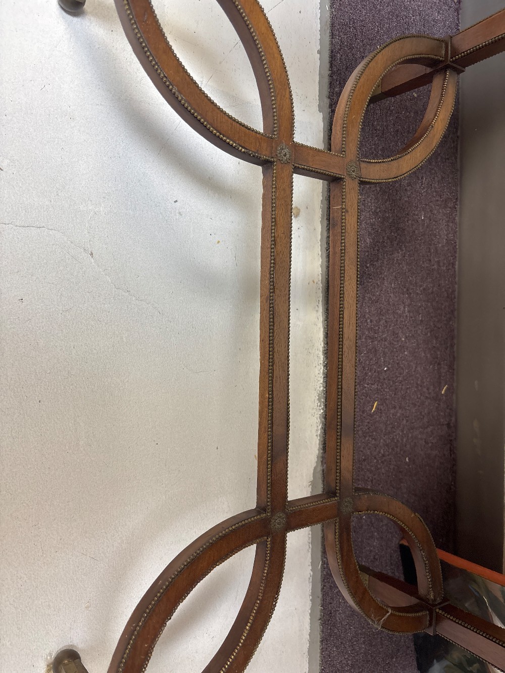 Beautiful side table with metal beading detail. One end missing metal trim (see photos). 30” wide by 20.5” deep by 29” tall