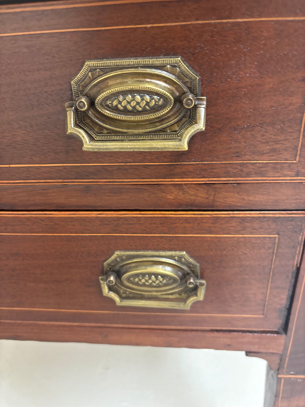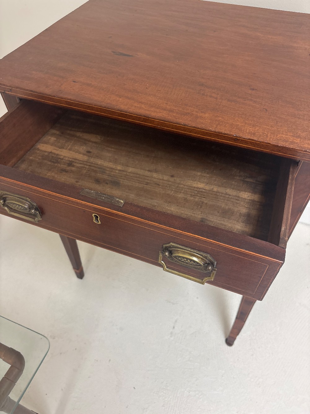 High-quality 2-drawer side table from just north of Amish Country in Central PA. From late 19th to early 20th century of either cherry or oak with brass handle pulls. Repaired leg 24"W x 20.5"D x 28.25"H
