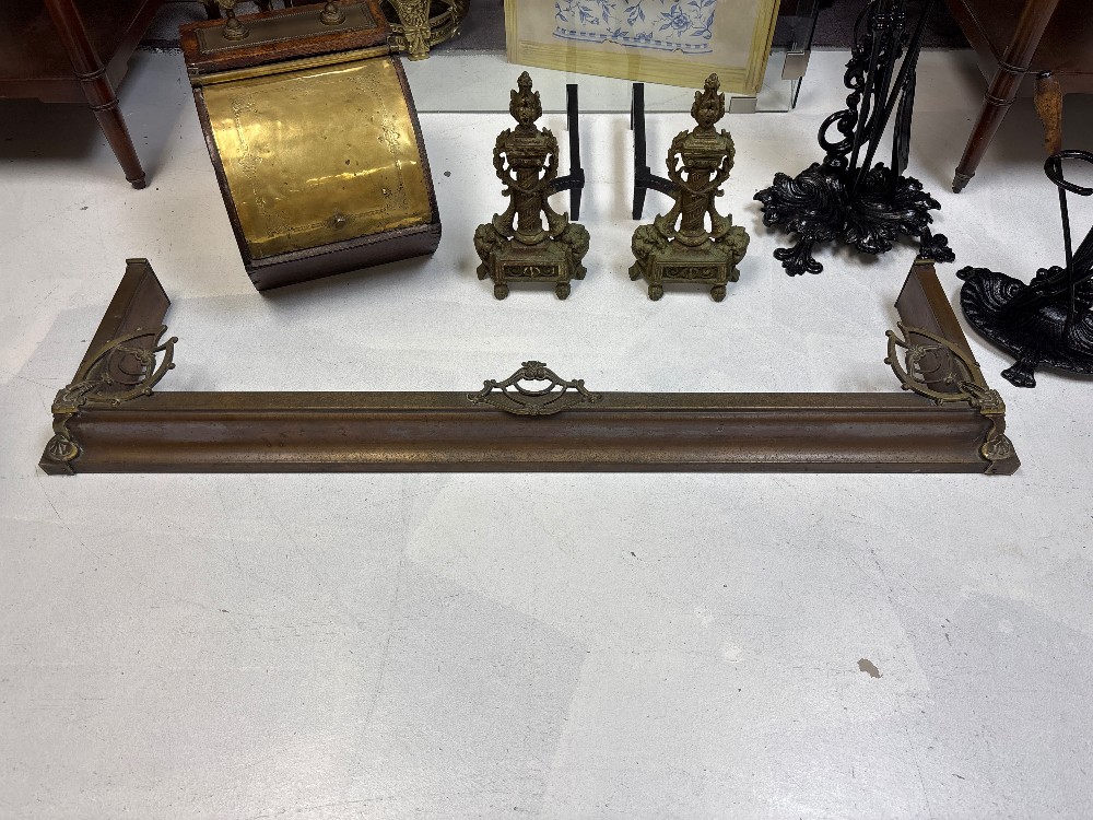 Antique brass fender with ornate corners and other detail. 50”x13”x 4”