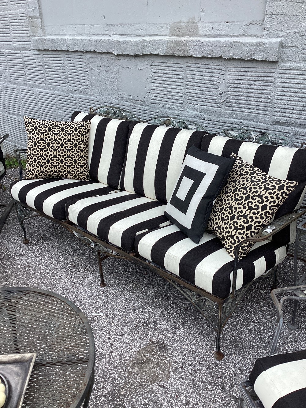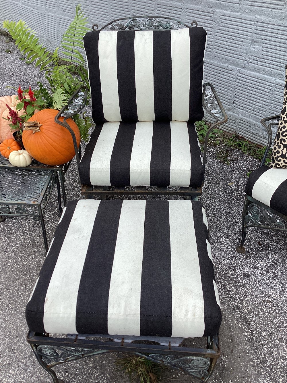 Sold as a set: couch Two arm chairs One ottoman Stripe coordinating cushions GUC, signs of wear from use, lots of life left!