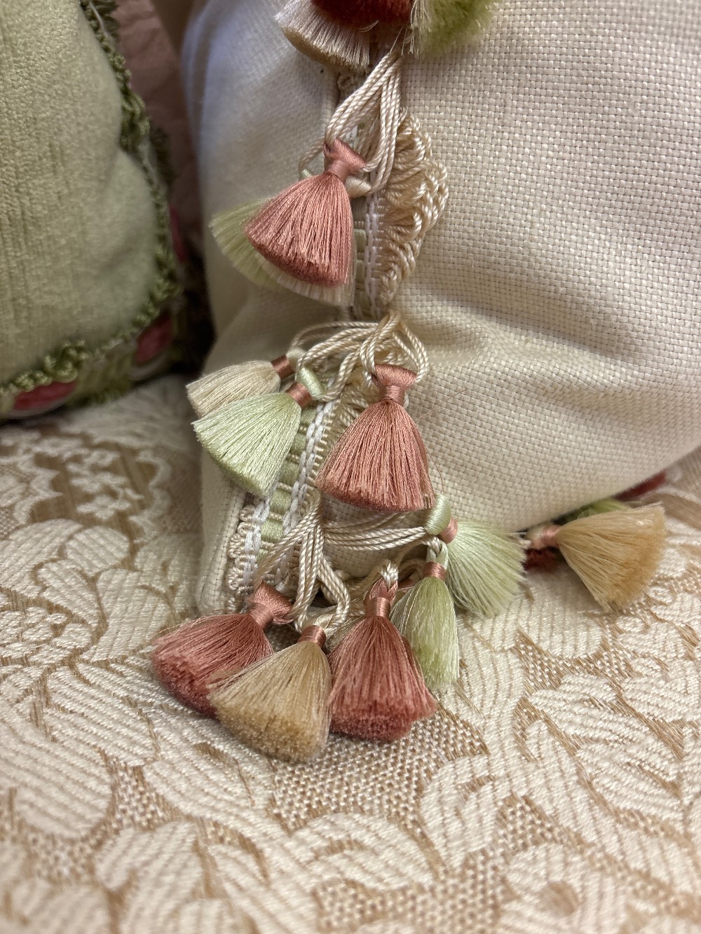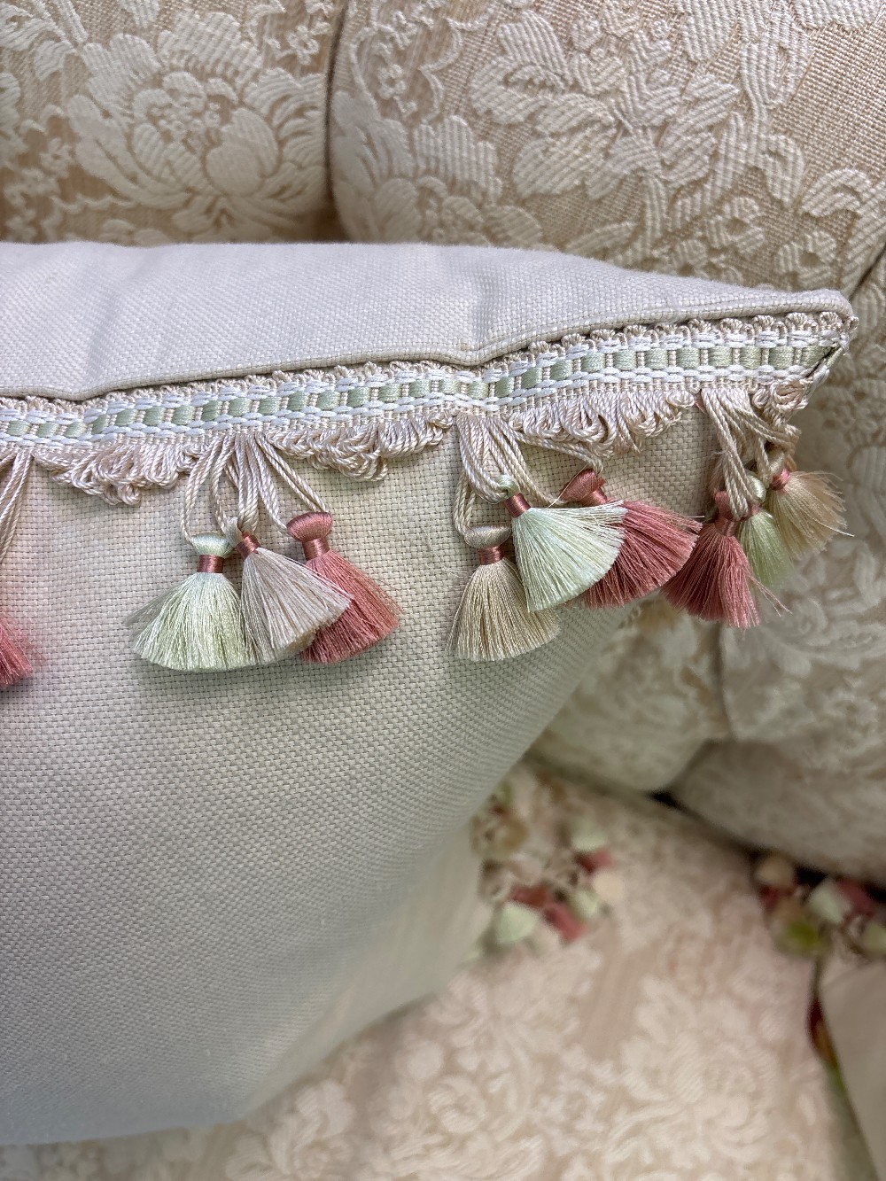 Custom down filled pillows in ivory with green and white tram plus pink green and ivory tassel. Two sets available for a total of four pillows.