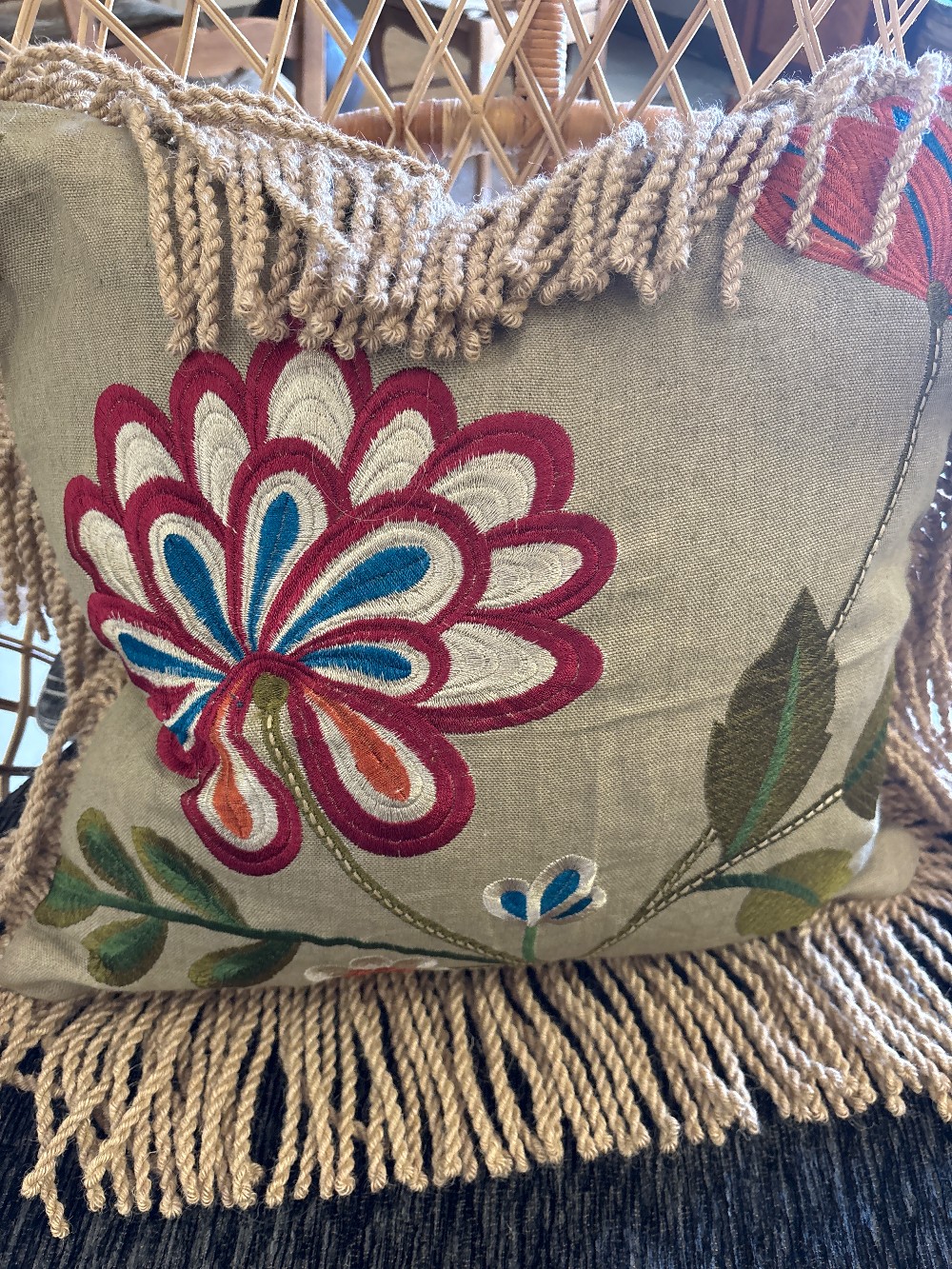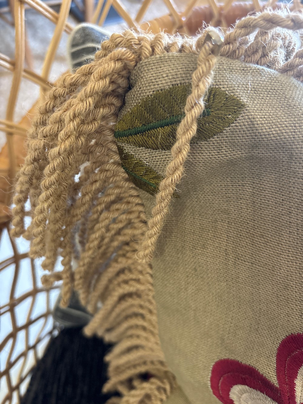 Handmade new tan linen fabric with colorful flowers and fun tassel trim. 18"