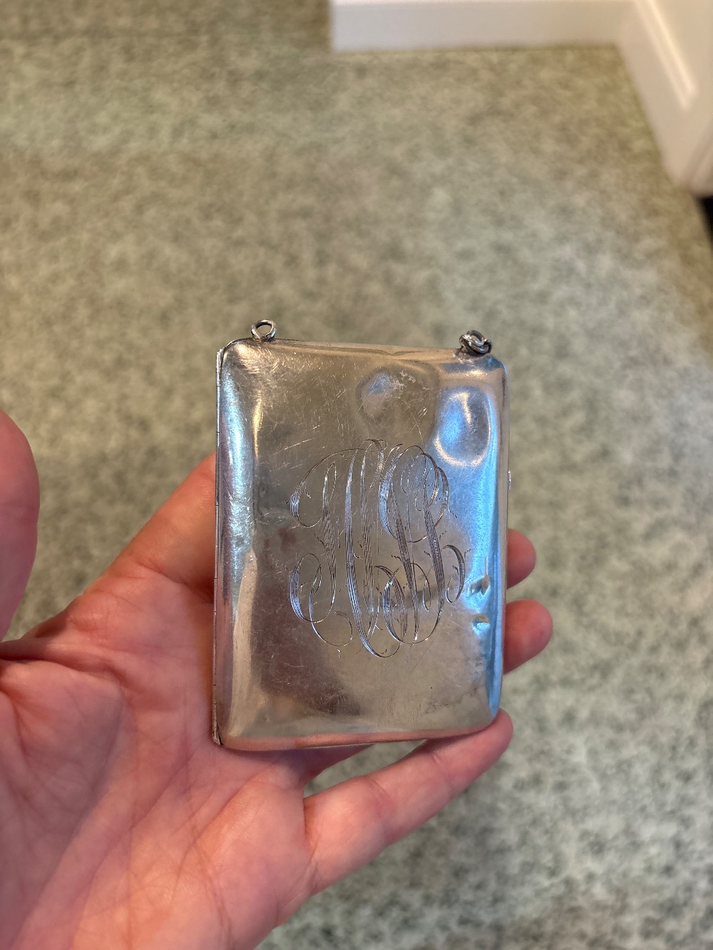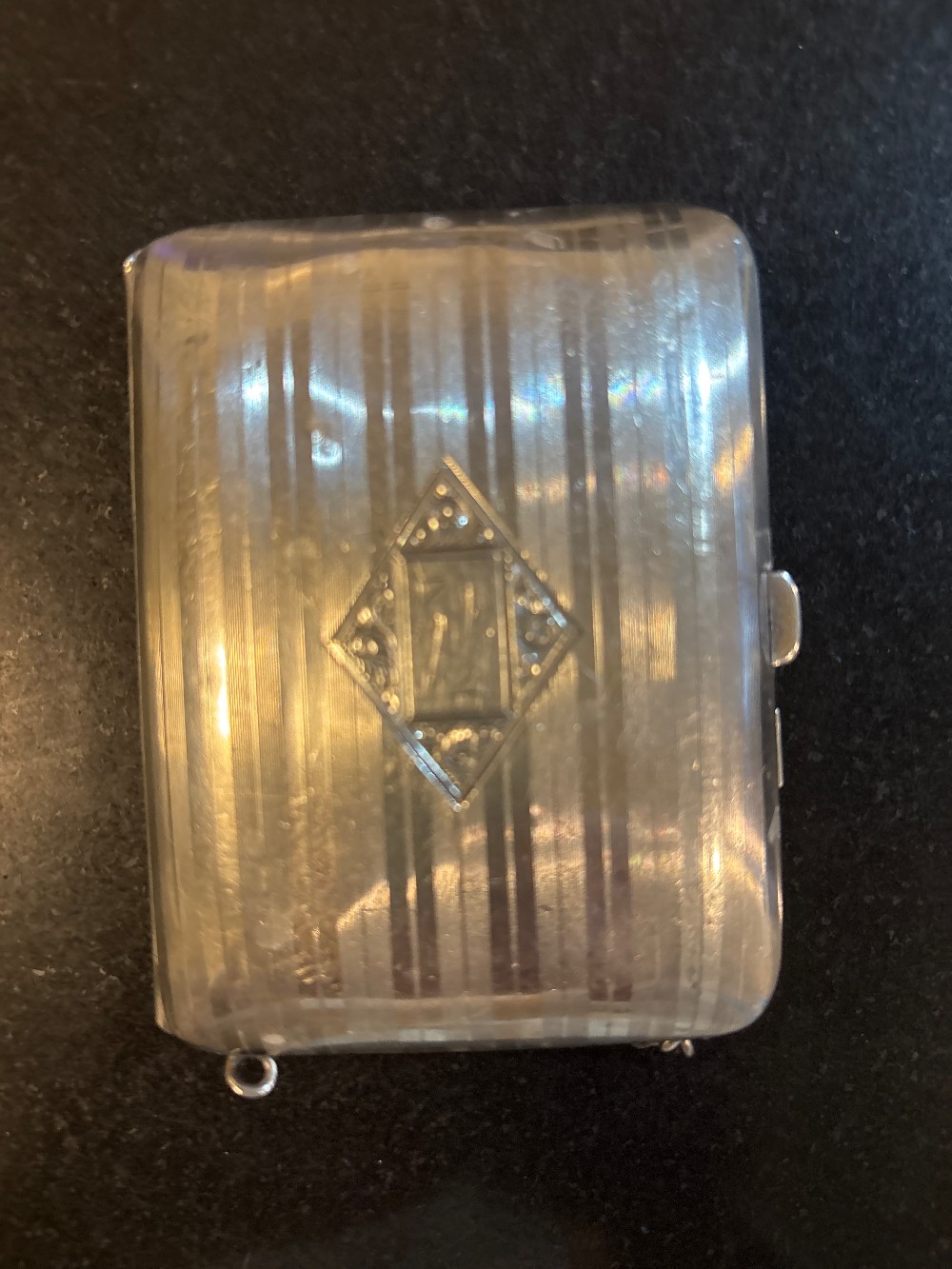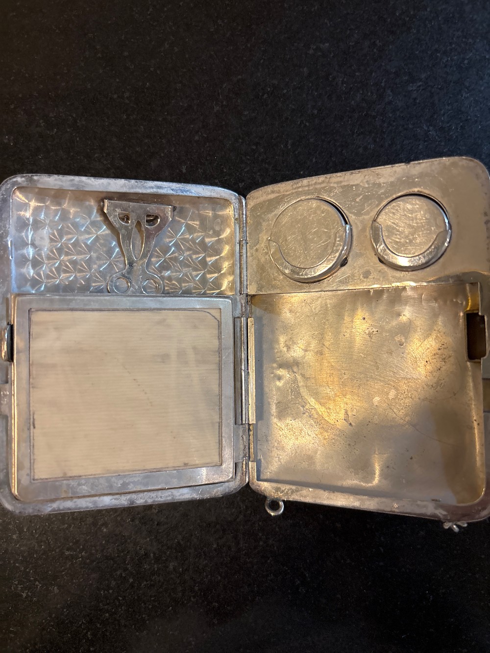 Antique silver cigarette case with coin purse. Features interior mirror on one side and photo holder on the other.