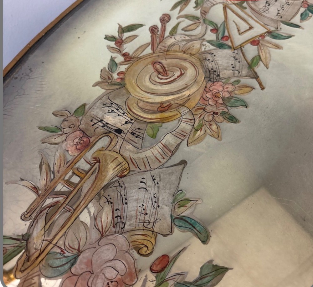 Antique mirror top with musical and floral scenes 45" diameter 29" height
