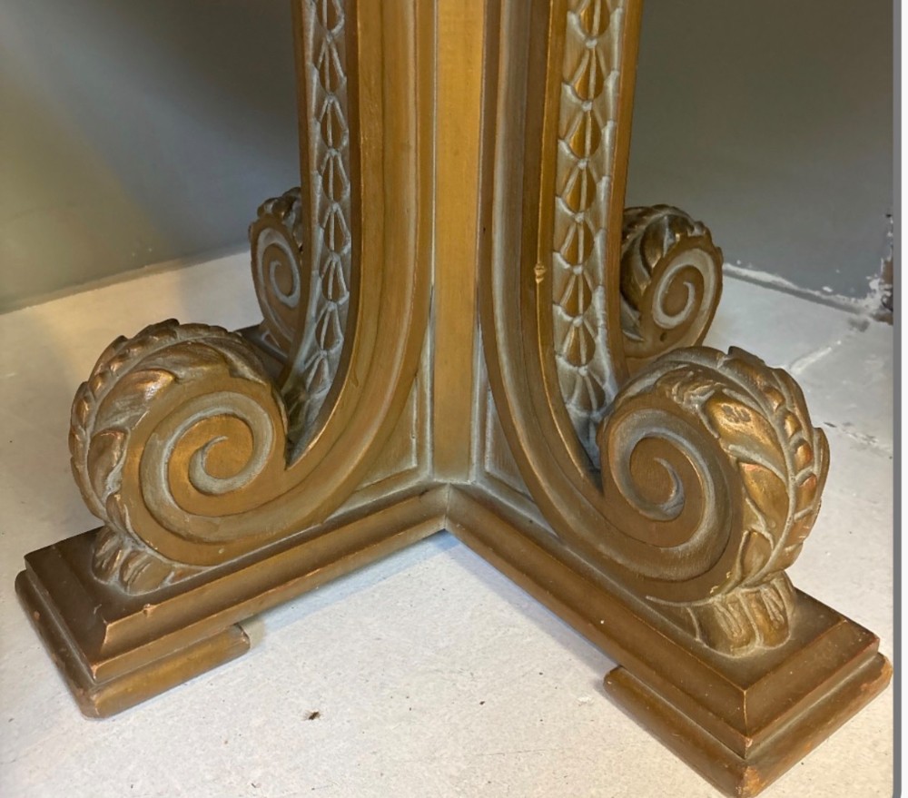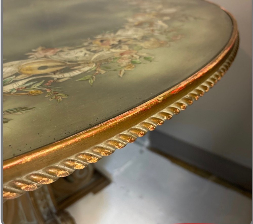 Exquisite round table with pedestal bottom. Antique mirror, top with hand, painted floral and musical scene. 45" round by 29" tall.