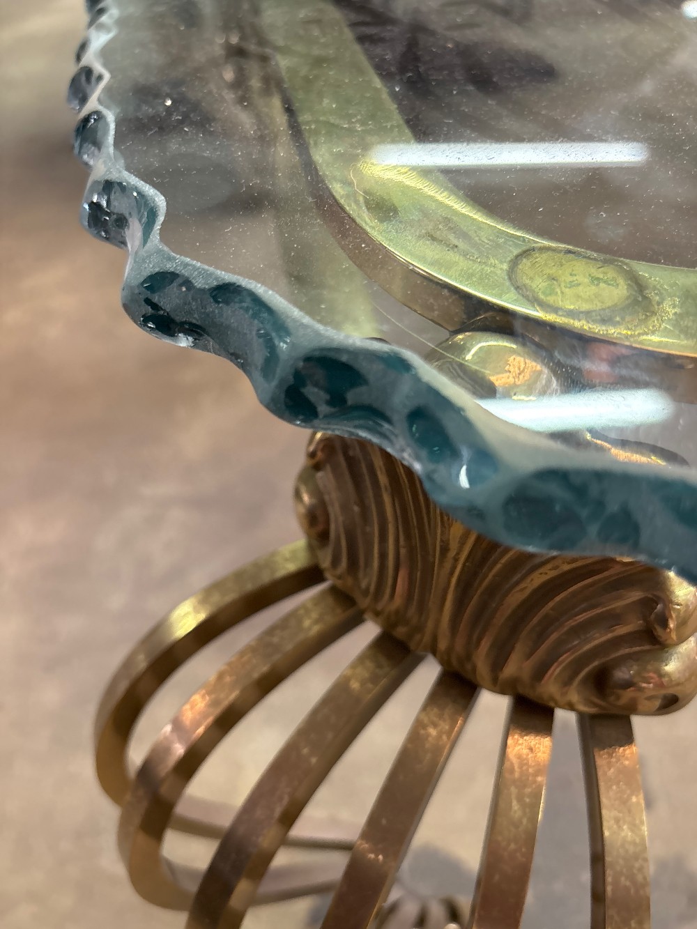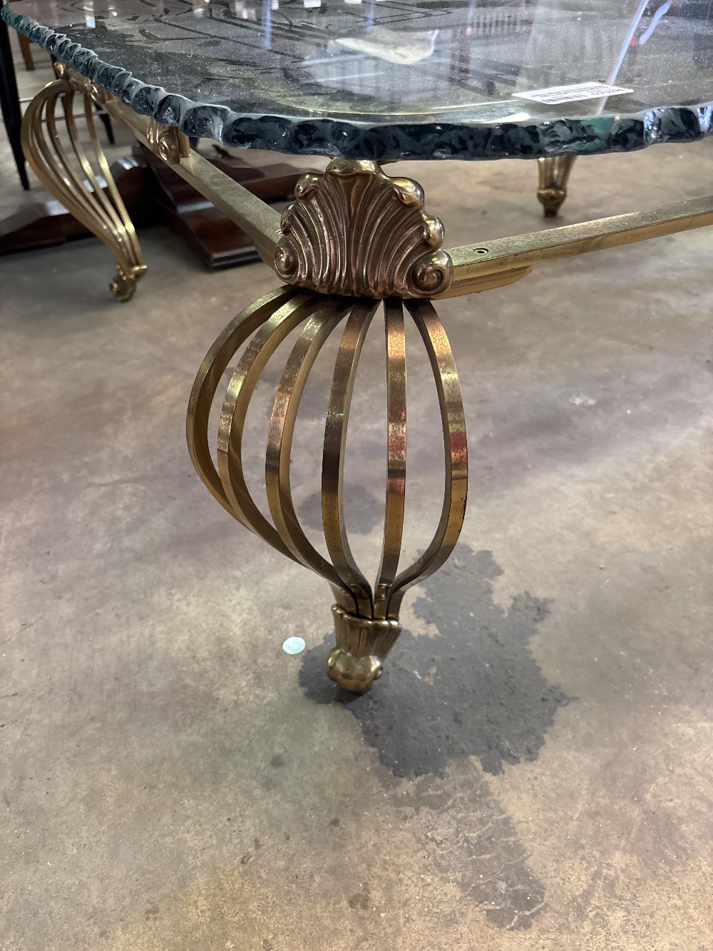 Vintage brass square coffee table with glass top with hammered edge. 44.5 square by 17.75 tall.